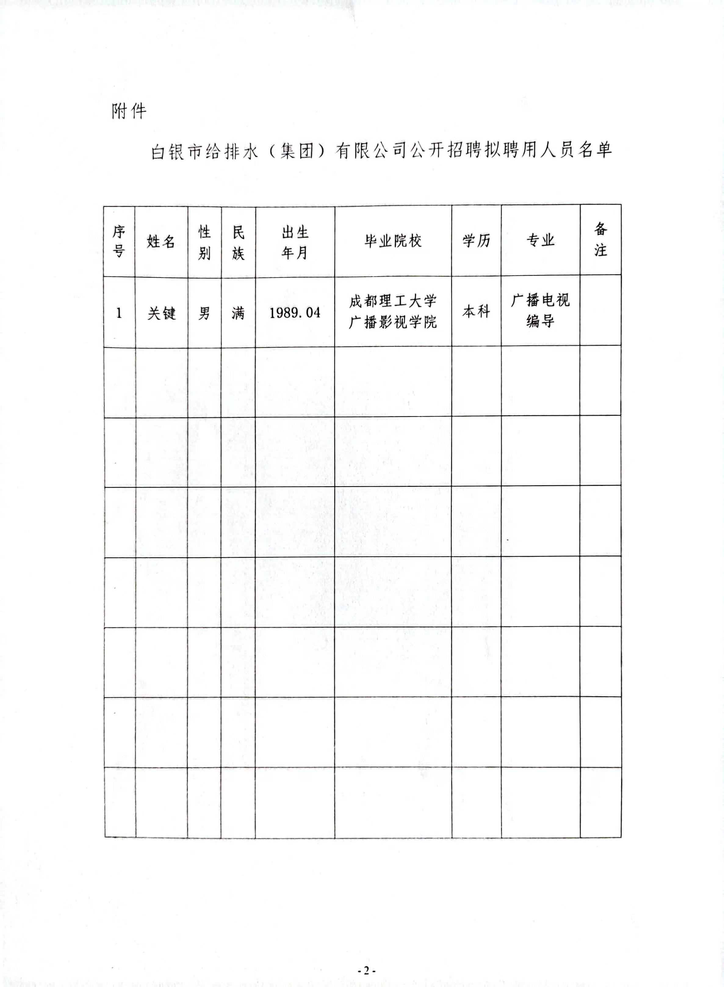 白銀市給排水(集團(tuán))有限公司2025年公開(kāi)招聘擬聘用人員的公示
